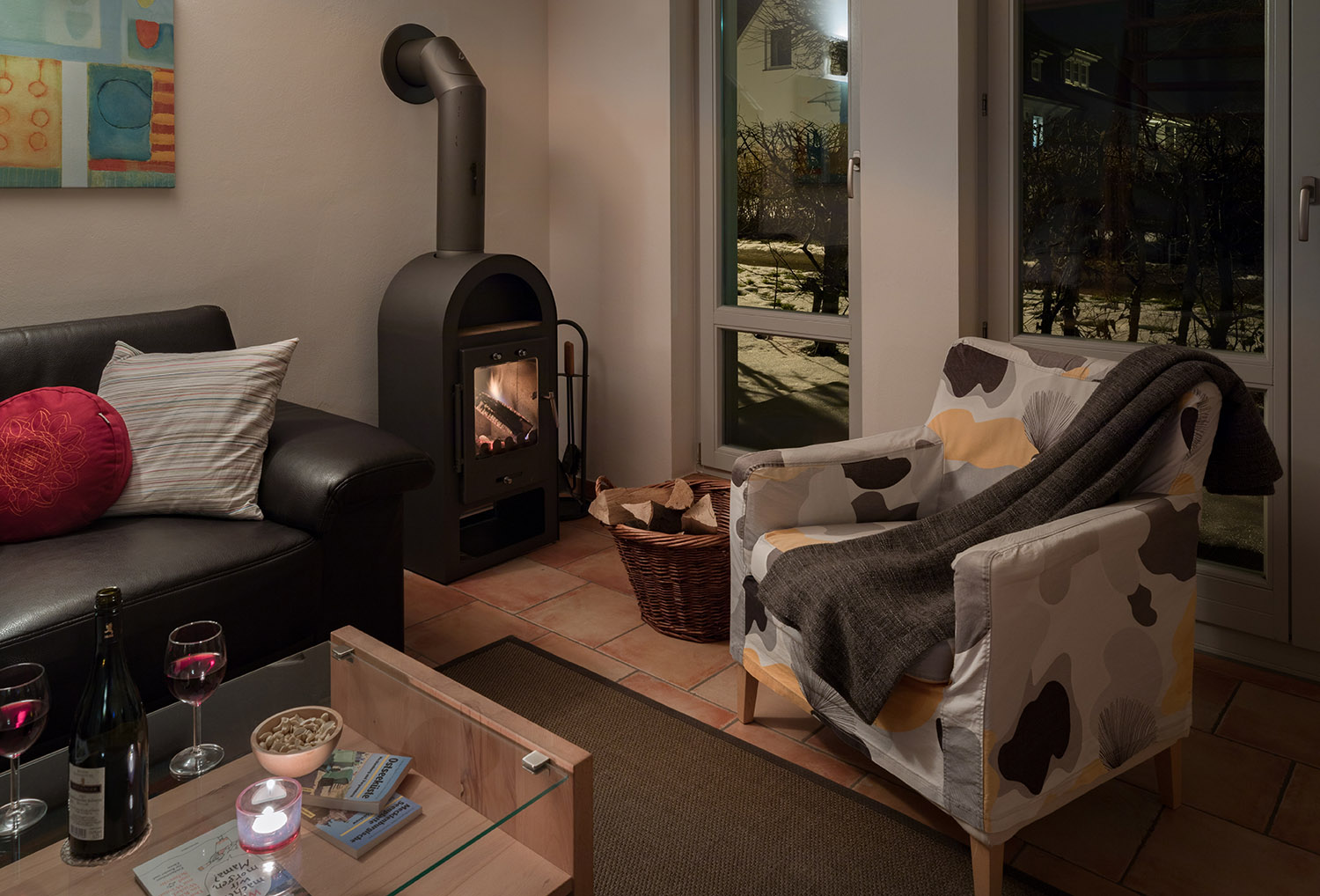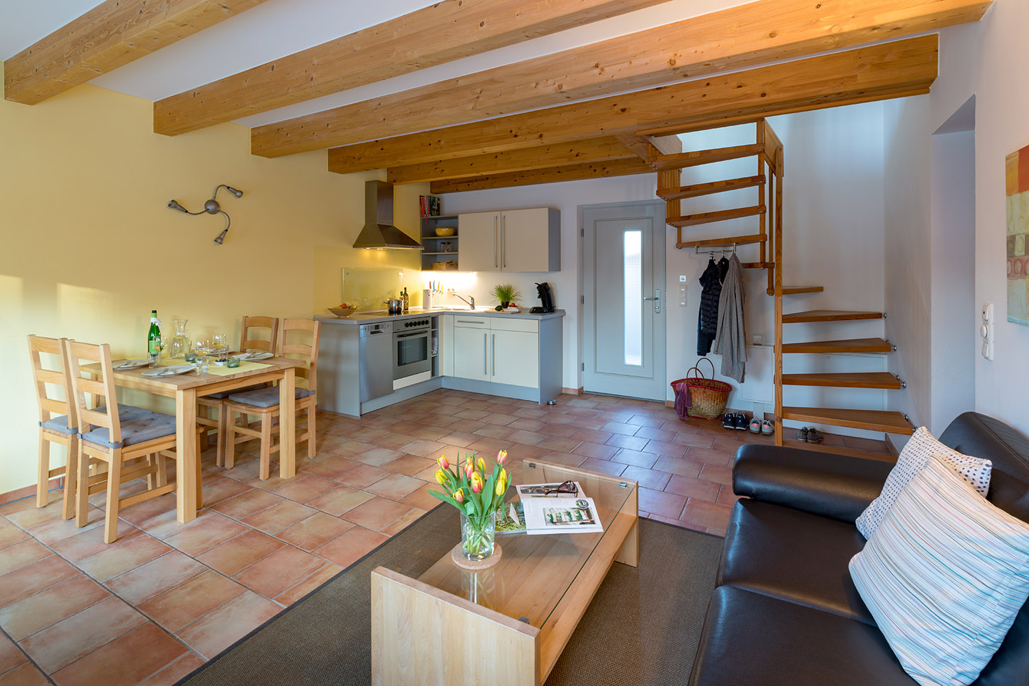 Das Ferienhaus (Nichtraucher) mit einer Größe von 64 qm bietet Platz für 3-4 Personen, ist hell und freundlich, sehr komfortabel und geschmackvoll ausgestattet. Es verfügt über einen Kaminofen und eine Sauna. Das Haus ist das Vordere von drei in Reihe gebauten, baugleichen Ferienhäusern und ist über einen eigenen Eingang erreichbar. Es hat eine eigene, nicht einsehbare Sonnenterrasse. Zum Haus gehört ein Stellplatz. Für weitere PKW stehen öffentliche Verkehrsflächen zur Verfügung.