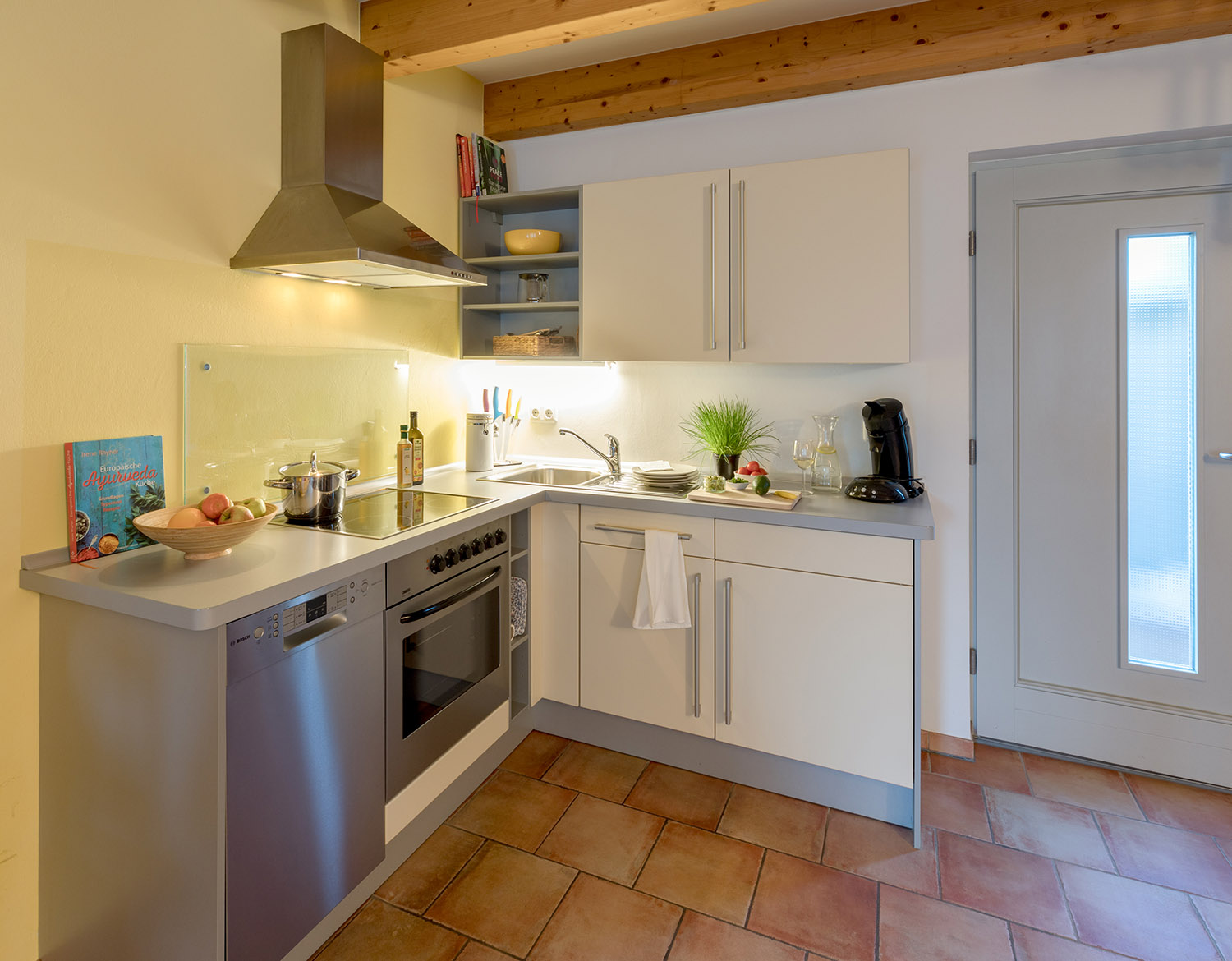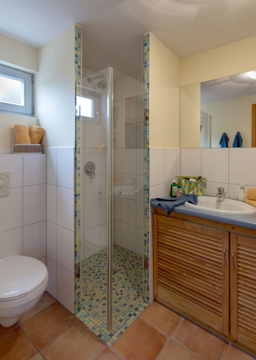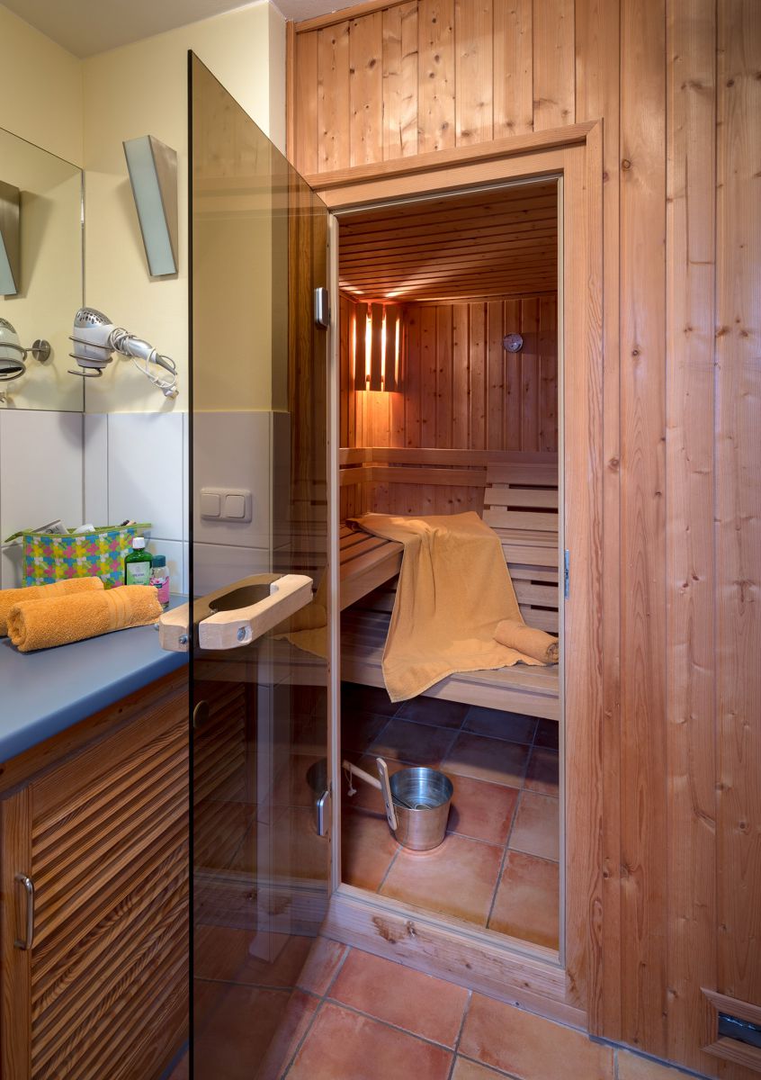 Im Erdgeschoss befindet sich die voll ausgestattete Küchenzeile inklusive Essecke, sowie der Wohnbereich mit Couch, Sessel, TV, DVD, Radio und Kaminofen. Des Weiteren befindet sich im Erdgeschoss das Bad mit Dusche und WC, sowie die Sauna. Vom Wohnbereich aus erreichen Sie die möblierte Terrasse.(SW-Ausrichtung).