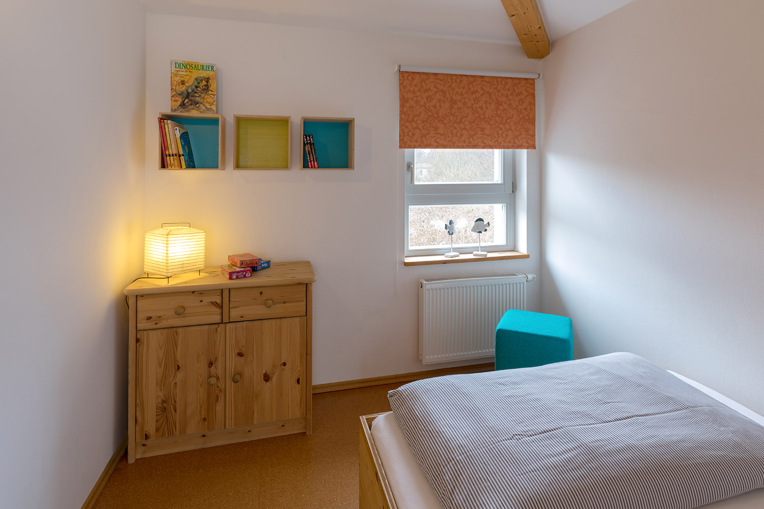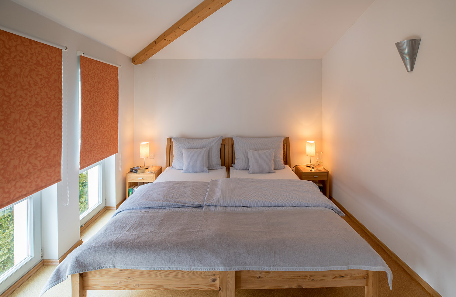 Im 1. Obergeschoss befinden sich zwei Schlafzimmer, welche mit einem Doppelbett (140x200) oder zwei Einzelbetten (90x200), die wiederum auseinandergestellt werden können, ausgestattet sind. Zur Ausstattung zählen ebenfalls ein Kleiderschrank und eine Kommode. Für einen erholsamen Schlaf sorgen Fliegentüren in beiden Sclafzimmern.