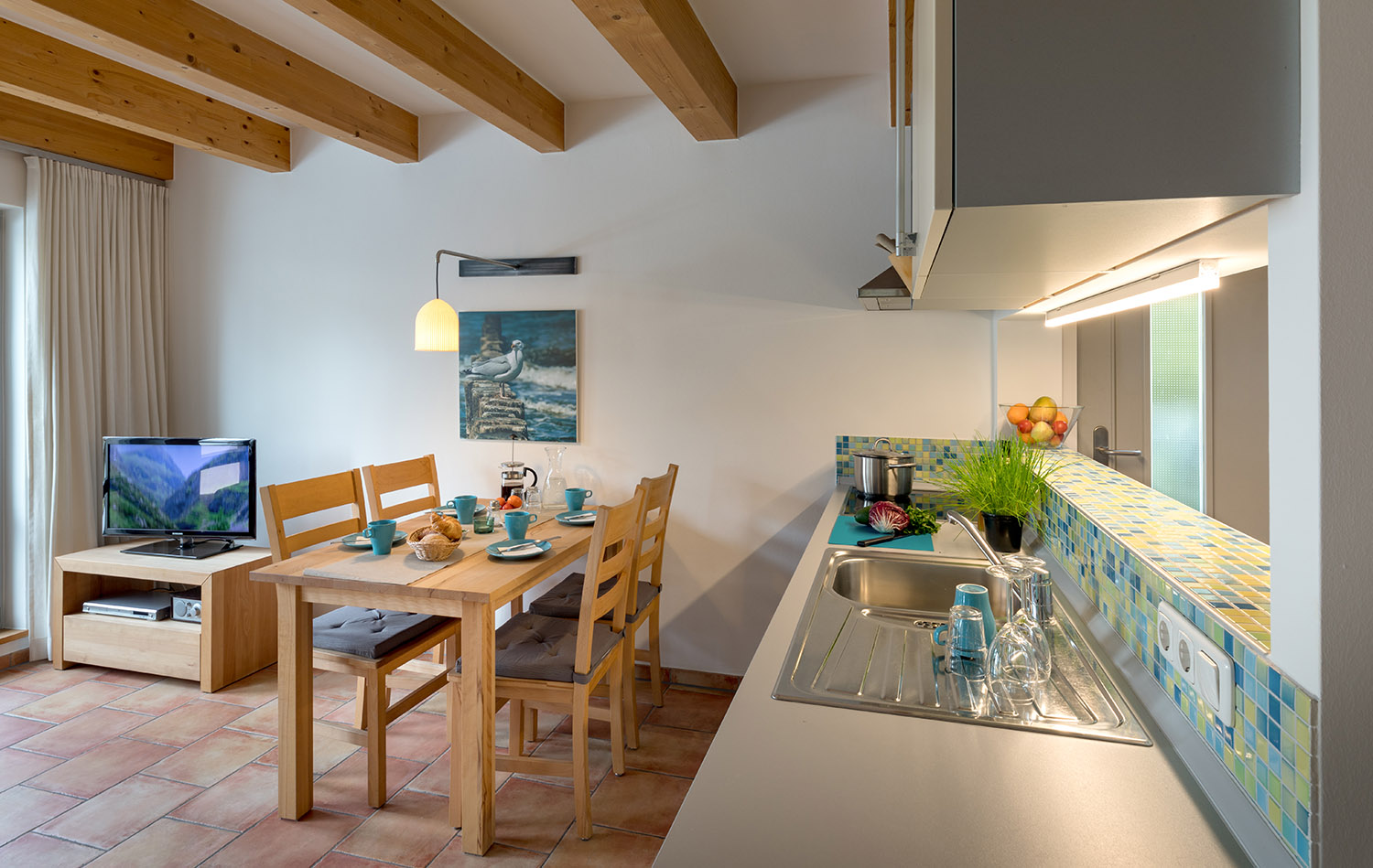 Im Erdgeschoss befindet sich die voll ausgestattete Küchenzeile inklusive Essecke, sowie der Wohnbereich mit Couch, Sessel, TV, DVD, Radio und Kaminofen. Des Weiteren befindet sich im Erdgeschoss das Bad mit Dusche und WC, sowie die Sauna. Vom Wohnbereich aus erreichen Sie die möblierte Terrasse.(SW-Ausrichtung).