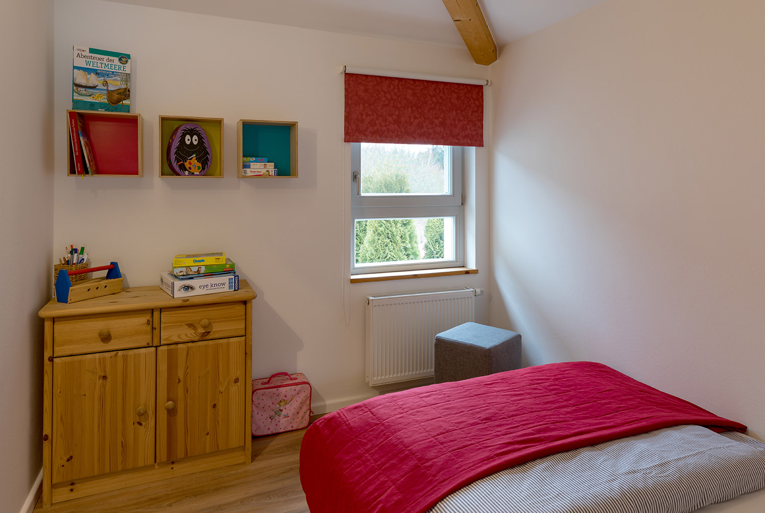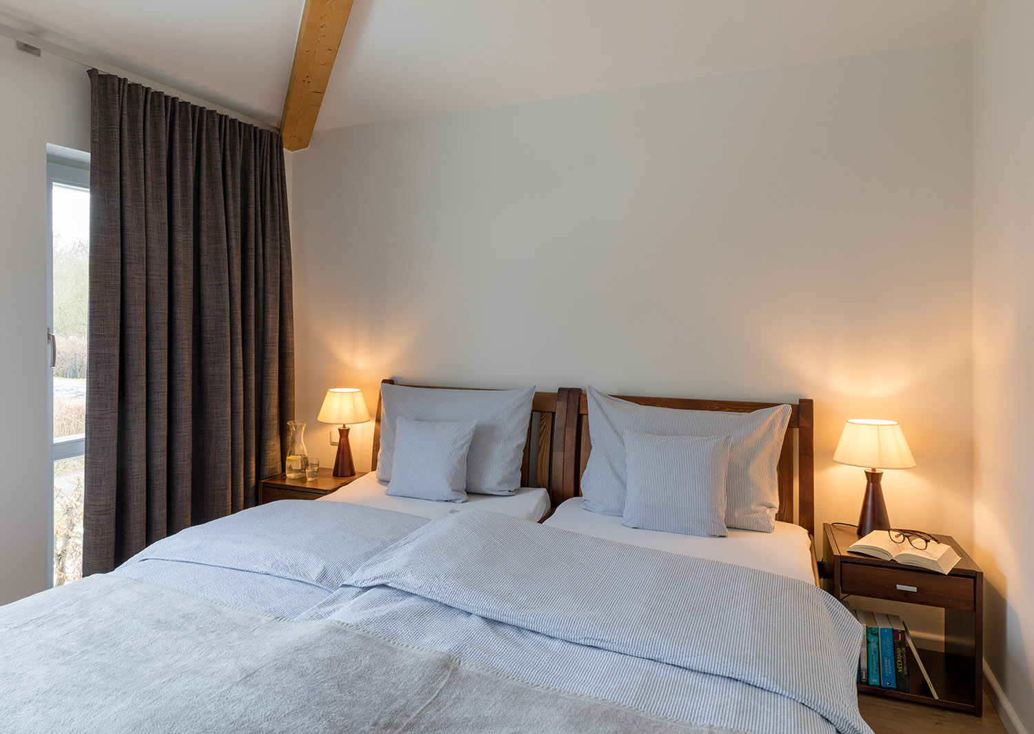 Im 1. Obergeschoss befinden sich zwei Schlafzimmer, welche mit einem Doppelbett (140x200) oder zwei Einzelbetten (90x200), die wiederum auseinandergestellt werden können, ausgestattet sind. Zur Ausstattung zählen ebenfalls ein Kleiderschrank und eine Kommode. Für einen erholsamen Schlaf sorgen Fliegentüren in beiden Schlafzimmern.